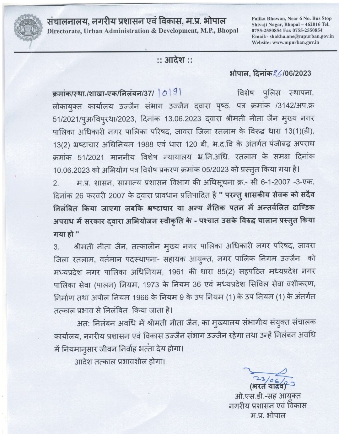 उज्जैन। नगर निगम उपायुक्त नीता जैन को आखिरकार राज्य शासन ने निलंबित कर ही दिया। नगर पालिका जावरा में पदस्थ दौरान रिश्वत लेते ट्रैप की गई जैन के खिलाफ हाल ही में लोकायुक्त ने अभियोजन स्वीकृति के बाद कोर्ट में चालान पेश कर दिया है। इसी के चलते राज्य शासन ने तत्काल प्रभाव से उपायुक्त नीता जैन को निलंबित कर दिया। सोमवार को इस संबंध में आदेश जारी हुए। निलंबन अवधि में उनका मुख्यालय नगरीय प्रशासन एवं विकास विभाग संयुक्त संचालक उज्जैन संभाग रहेगा। इस अवधि में उन्हें जीवन निर्वाह भत्ते की पात्रता भी रहेगी।