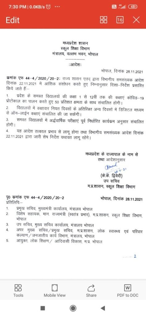 केंद्र से जारी निर्देशों के बाद शासन ने स्कूलों को 50 फ़ीसदी क्षमता से ही खोलने का आदेश तत्काल प्रभाव से जारी किया। हालांकि मुख्यमंत्री शिवराज सिंह चौहान ने कहा कि फिलहाल सार्वजनिक व अन्य बड़े आयोजनों पर रोक नहीं रहेगी लेकिन लोग खुद नियमों का पालन करें ताकि संक्रमण का खतरा ना फैले। इसके साथ ही सभी जिलों में आरटीपीसीआर जांच बढ़ाने और कोविड वार्डो में मरीजों के लिए जरूरी तैयारियां रखने के निर्देश दिए गए हैं। ताकि जरूरत पड़ने पर मरीजों को तत्काल उपचार मिल सके। जरा सी चूक भी भारी पड़ सकती है डब्ल्यूएचओ की चेतावनी अनुसार दोनों डोज लगा चुके व्यक्ति भी नए वेरिएंट का शिकार हो रहे हैं। ऐसे में सावधानी बेहद जरूरी है।